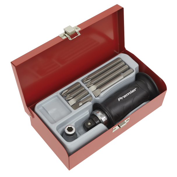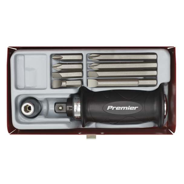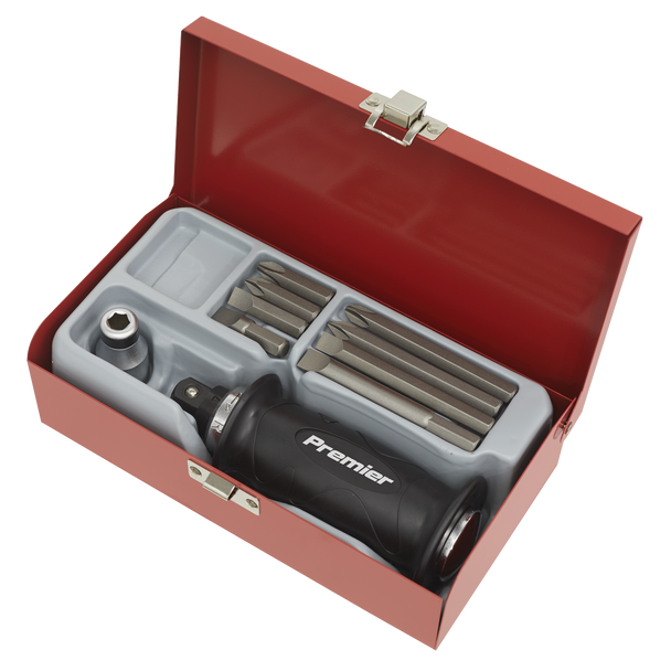 Introducing the Sealey AK2082 Premier Impact Driver Set, an essential tool for both professionals and DIY enthusiasts. This comprehensive 10-piece set features a robust design to ensure optimal performance during tough tasks. Each impact driver is equipped with a protective grip that enhances comfort and control, minimizing hand fatigue during extended use. The set includes a variety of sizes and types of drivers, making it perfect for a wide range of applications, from automotive repairs to home improvement projects. The high-quality material ensures durability and reliability, making the Sealey AK2082 a valuable addition to your toolkit.