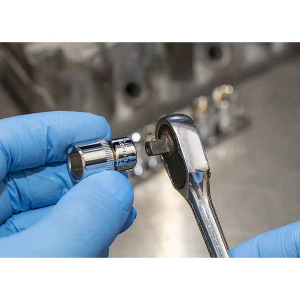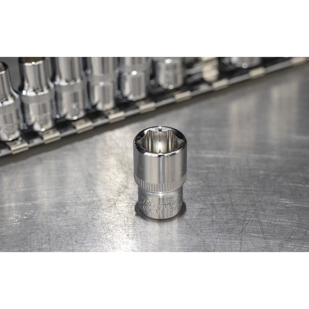 Chrome Vanadium steel 6-point sockets, hardened and tempered for added strength. Fully polished chrome finish for corrosion resistance. WallDrive® configuration giving an additional 30% more torque handling power than traditional sockets. Knurled ring for extra grip with oily fingers. Supplied with socket rail.
