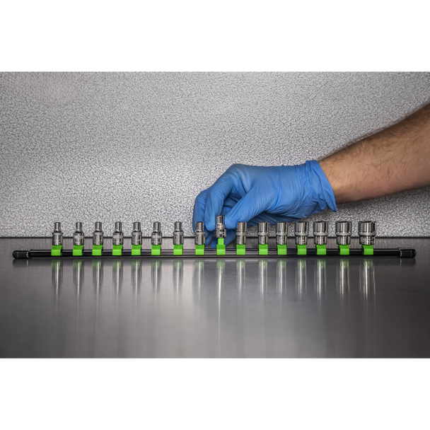 Sealey AK27052HV | Premier Socket Retaining Rail with 16 Clips 1/4"Sq Drive - Hi-Vis GreenSealey AK27052HV | Premier Socket Retaining Rail with 16 Clips 1/4″Sq Drive – Hi-Vis Green