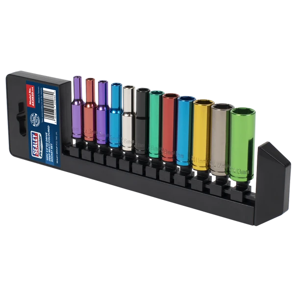 The Sealey AK282D | Premier Deep Multi-Coloured Socket Set 1/4″Sq Drive 12pc is designed for dependable professional use. Multi-coloured Chrome Vanadium steel deep socket set.