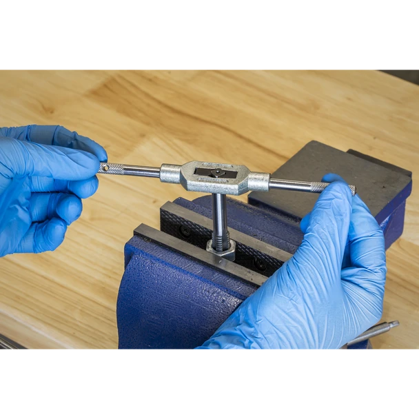 High carbon steel taps and dies. Dies with machined lead-ins for ease of use. Set includes one long handled adjustable tap wrench with professional type sliding jaw. Steel die holder with retention screw, suitable for dies from M3 up to M12. Also includes T-Bar type tap wrench, screwdriver and thread gauge. Supplied in storage case.