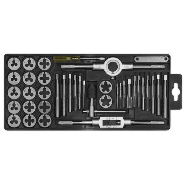 The Sealey AK301 | Metric Tap & Die Set Split Dies 40pc is designed for dependable professional use. High carbon steel taps and dies.