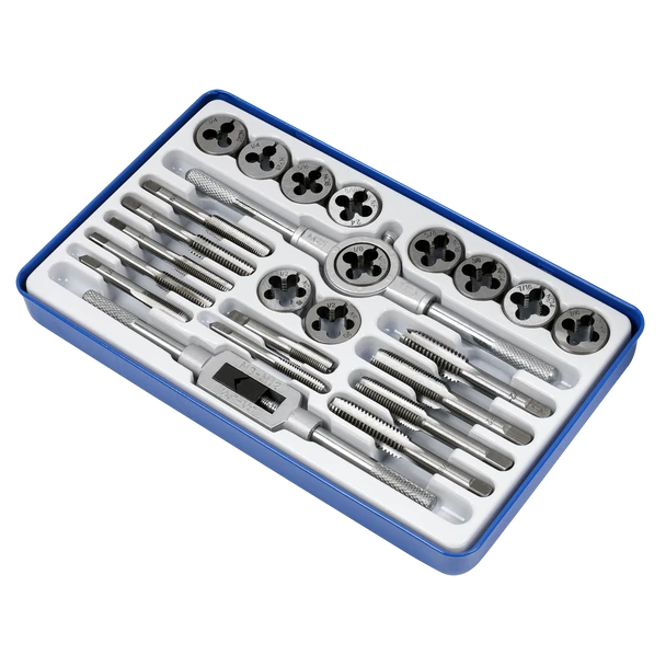 - Contents: Taps and Dies in following sizes; 1/4″-20, 1/4″-28, 5/16″-18, 5/16″-24, 3/8″-16, 3/8″-24, 7/16″-14, 7/16″-20, 1/2″-13, 1/2″-20, 1/8″-27 and double-ended tap wrench and die holder with retention screw.