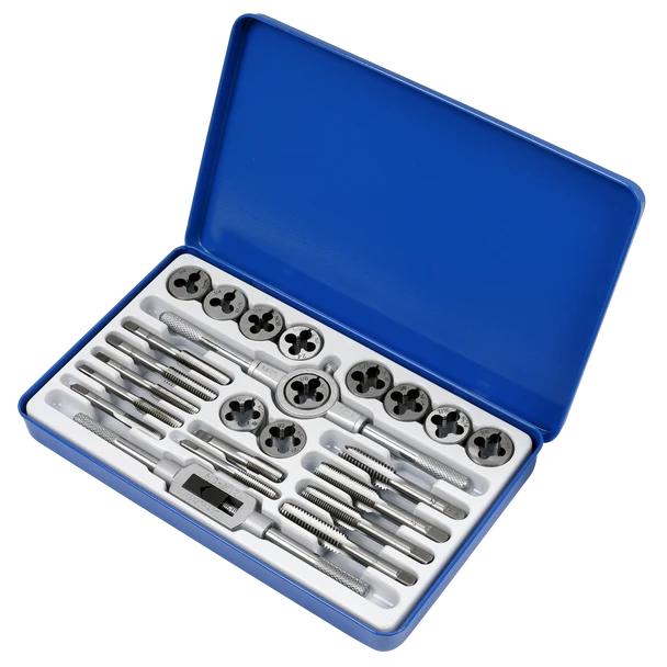 Precision machined, carbon steel taps and dies. Dies are split to allow the fine adjustment of core diameter. Set includes imperial coarse and fine sizes. Includes double-ended tap wrench and die holder with retention screw. Supplied in metal storage case.