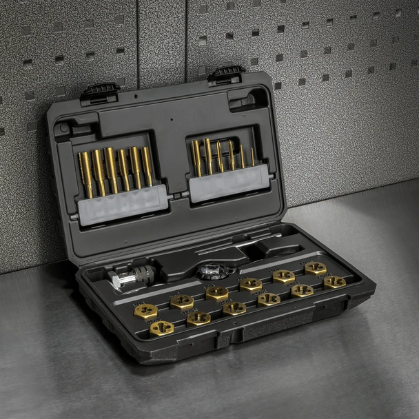 High quality Titanium coated taps and dies. Features hex shaped dies providing a more secure fit in the die holder. Dies can also be used with a socket or spanner. Supplied in storage case.
