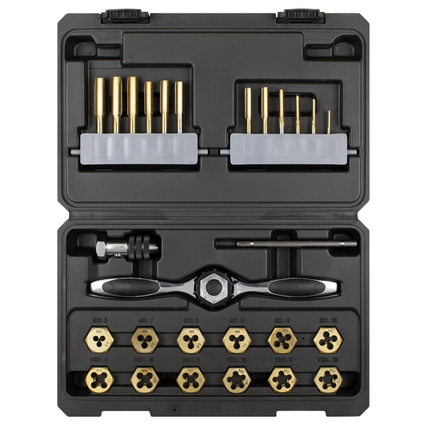 - CONTENTS: Taps & Dies; 3 x 0.5, 4 x 0.7, 5 x 0.8, 6 x 1, 8 x 1, 8 x 1.25, 10 x 1, 10 x 1.25, 10 x 1.5, 12 x 1.25, 12 x 1.5 , 12 x 1.75 T-Type Tap Wrench, Hex Die Handle.