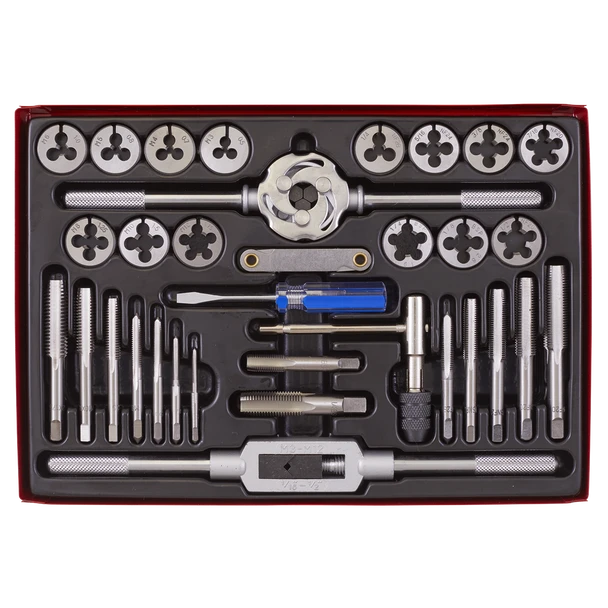 - Contents: Taps and Dies; M3 x 0.5, M4 x 0.7, M5 x 0.8, M6 x 1, M8 x 1.25, M10 x 1.5, M12 x 1.75, UNF 1/4″-28, 5/16″-24, 3/8″-24, 7/16″-20, 1/2″-20, BSP 1/8″-28, 1/4″-19. Tap Wrench, T-Bar Tap Wrench, Die Holder, Thread Gauge, Screwdriver.