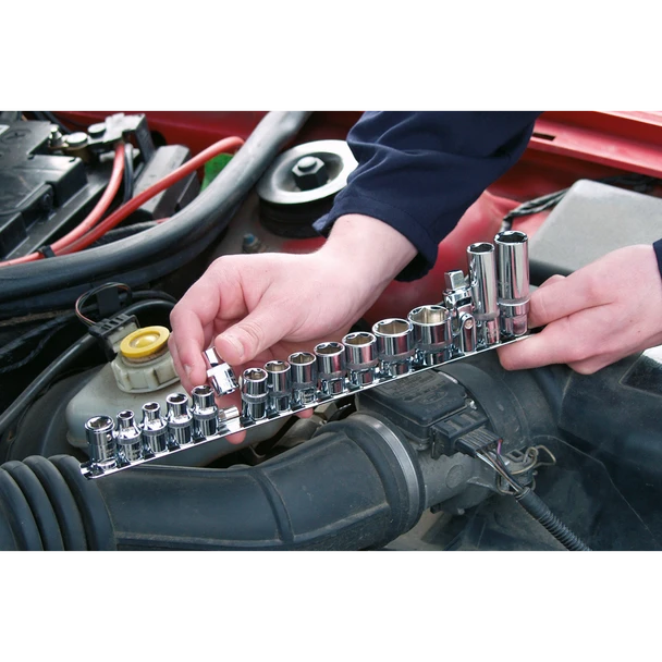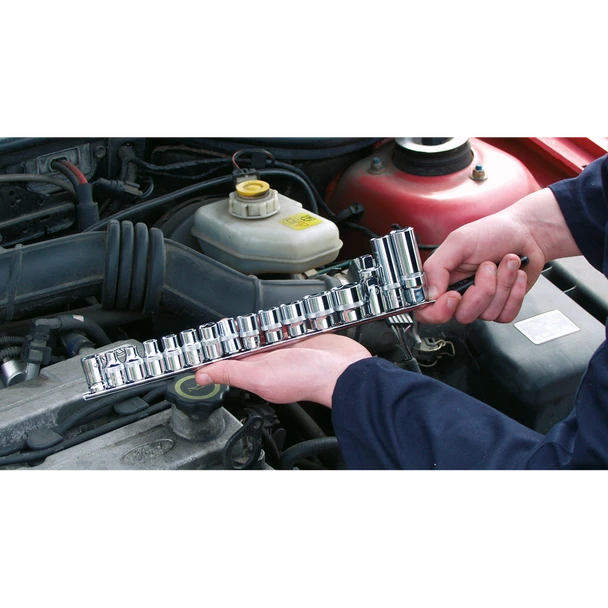 Tidy storage for loose sockets. Carry rail to the job or mount onto wall or toolbox. Handle marked with drive size. Supplied with 14 socket clips.