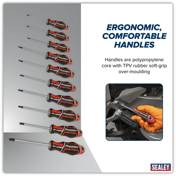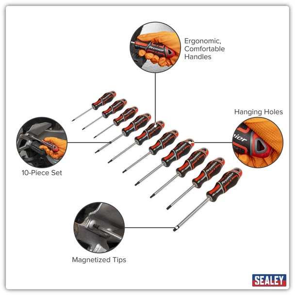 “description”: “Sealey AK4324 | Premier GripMAX TRX-Star* Screwdriver Set 10pc – Red professional workshop product designed for reliable day-to-day use.”,