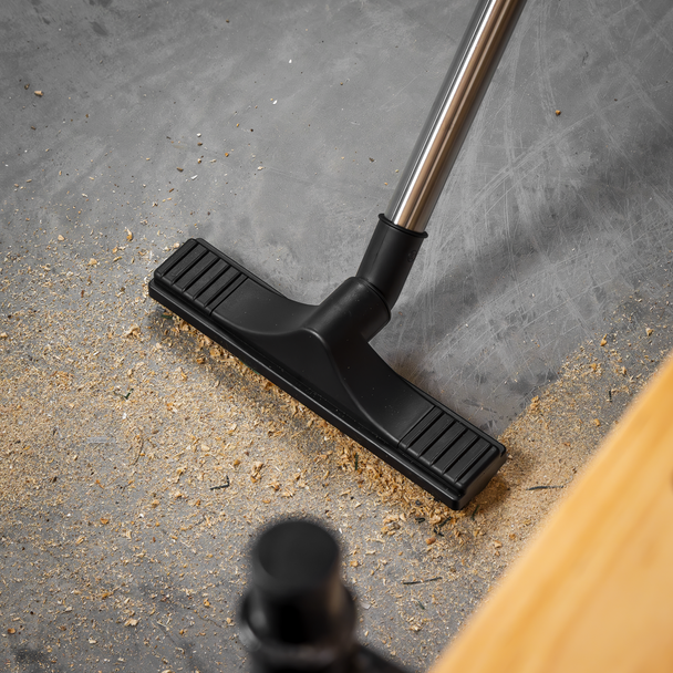 • ACCESSORIES – Fitted with 5m cable and 1.5m suction hose. Supplied with three aluminium extension tubes, cartridge filter, wet-use foam filter, dust collection bag, power tool adapter, floor brush, crevice tool and round brush.