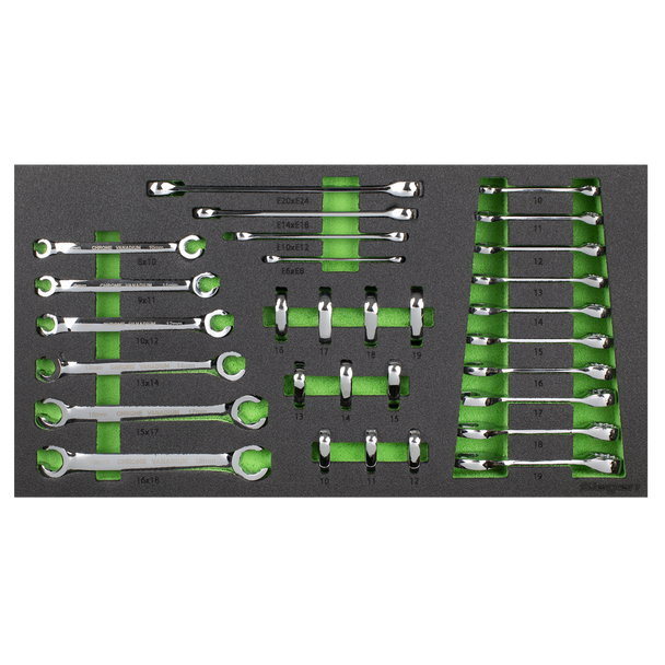 • 30PC SPECIALISED SPANNER SET WITH TOOL TRAY – Contents: Stubby Combination Spanners; 10, 11, 12, 13, 14, 15, 16, 17, 18, 19mm, TRX-Star* Double Ended Spanners; E6 x E8, E10 x E12, E14 x E18, E20 x E24, Flare Nut Spanners: 8 x 10, 9 x 11, 10 x 12, 13 x 14, 15 x 17, 16 x 18mm, 3/8″Sq Drive Crow’s Foot Spanners; 10, 11, 12, 13, 14, 15, 16, 17, 18, 19mm.