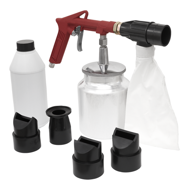 • Supplied with a set of four rubber nozzles for sealing the gun head to the panel and a 700g bottle of blasting grit.