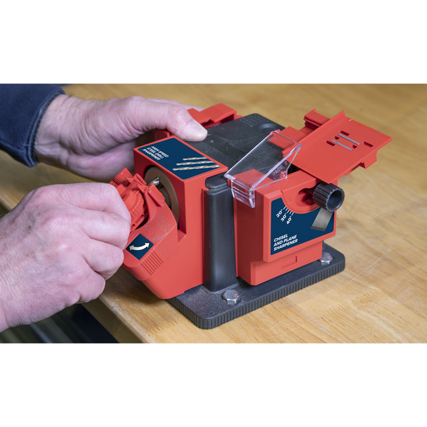 • Also re-grinds chisels and plane blades up to 50mm wide.