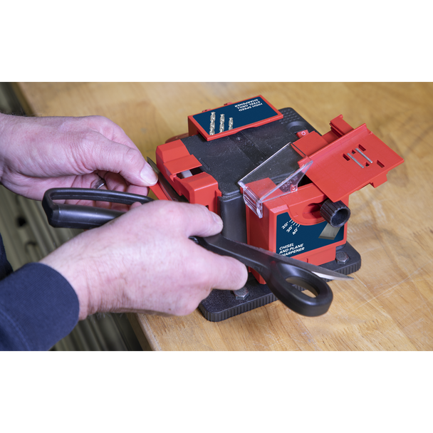 • Sharpens all HSS drill bits from Ø3-13mm, straight edged knives and scissors.