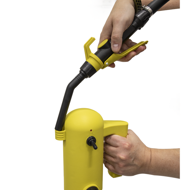 • Pump housing features a convenient holder for storing the dispensing nozzle.