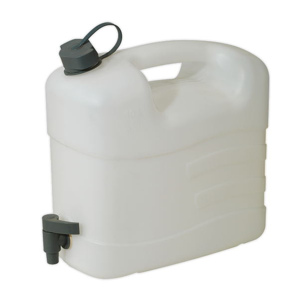 • 10L Polyethylene fluid container with attached screw cap and tap for easy fluid control.